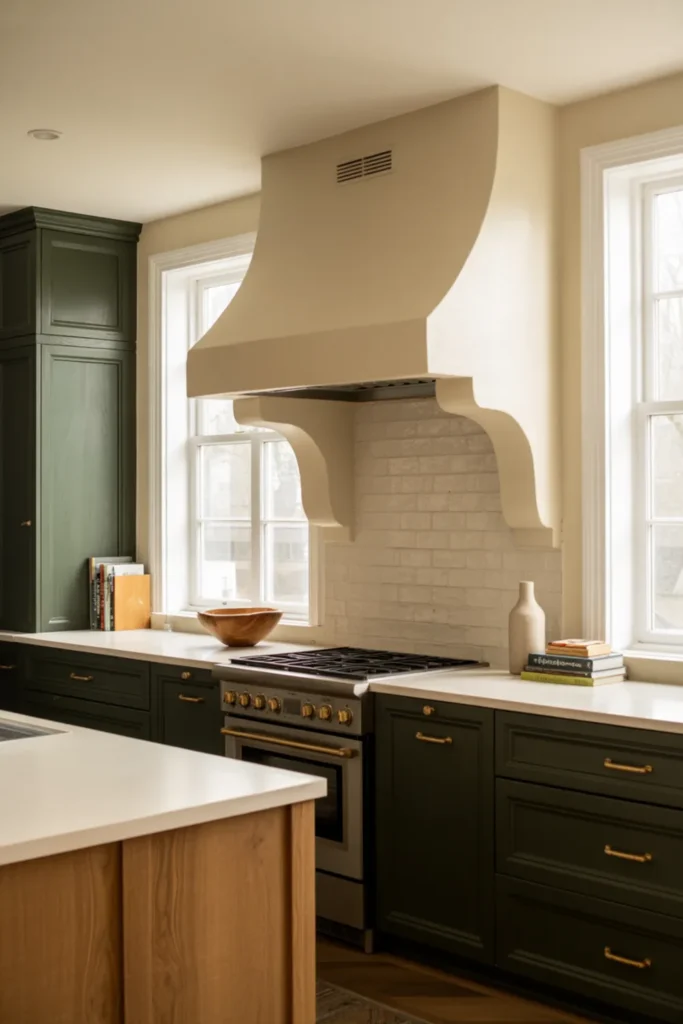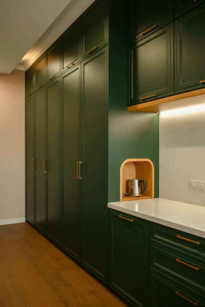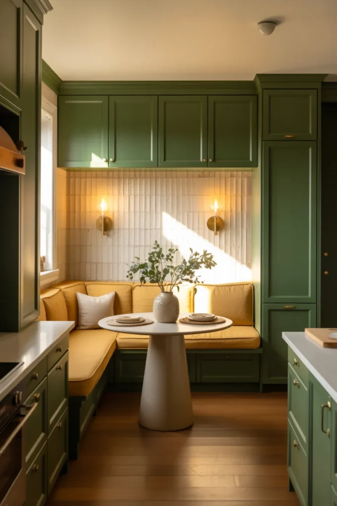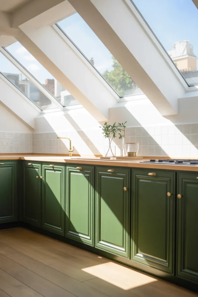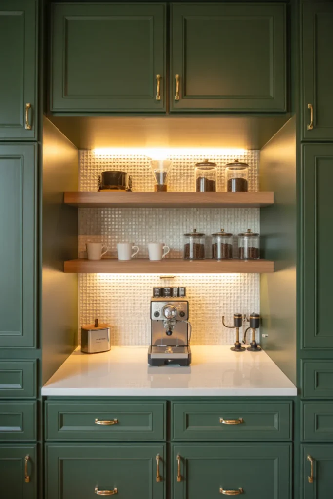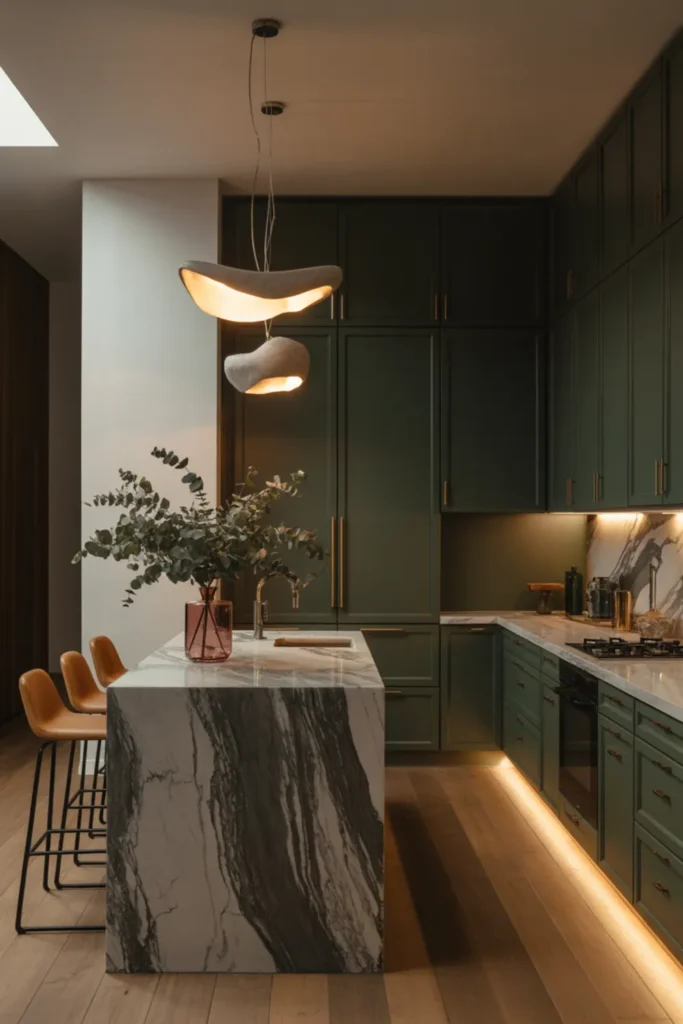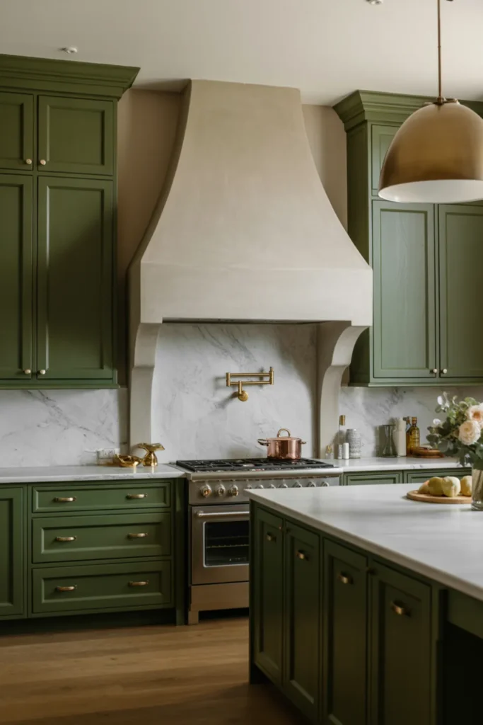 Light quartz countertops and a white backsplash make the green feel fresh, not heavy. Soft lighting helps too, especially at night.