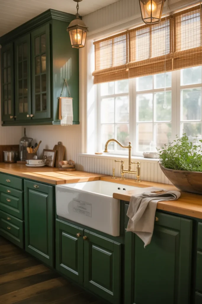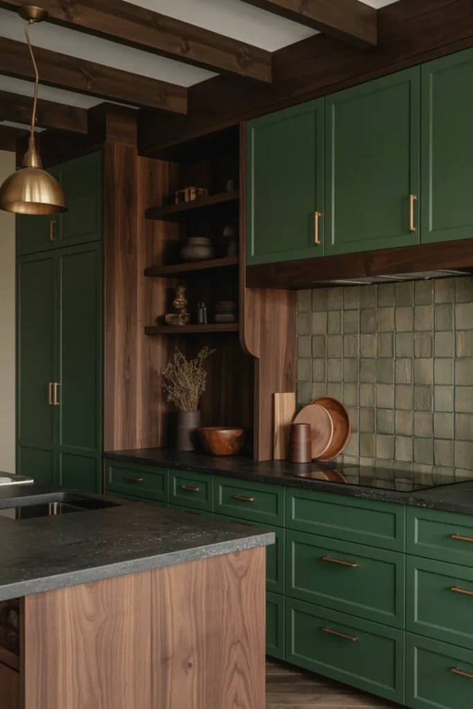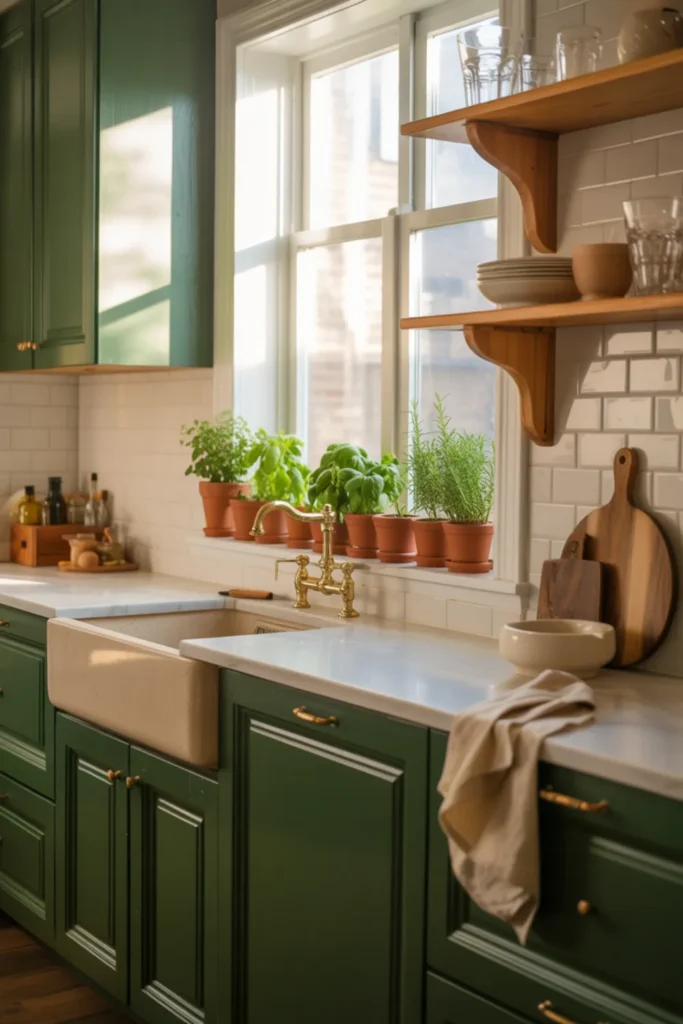 Matte black hardware gives the green a modern edge, while brass can add warmth in small doses. Soft clay or terracotta accents look great too, like a runner or a bowl on the island.