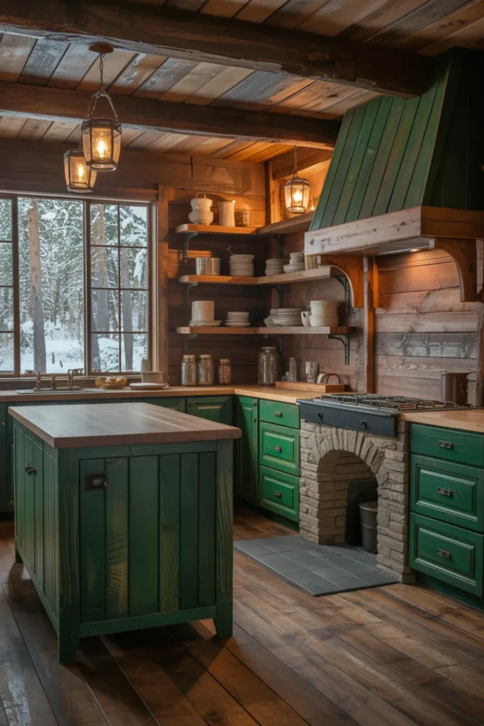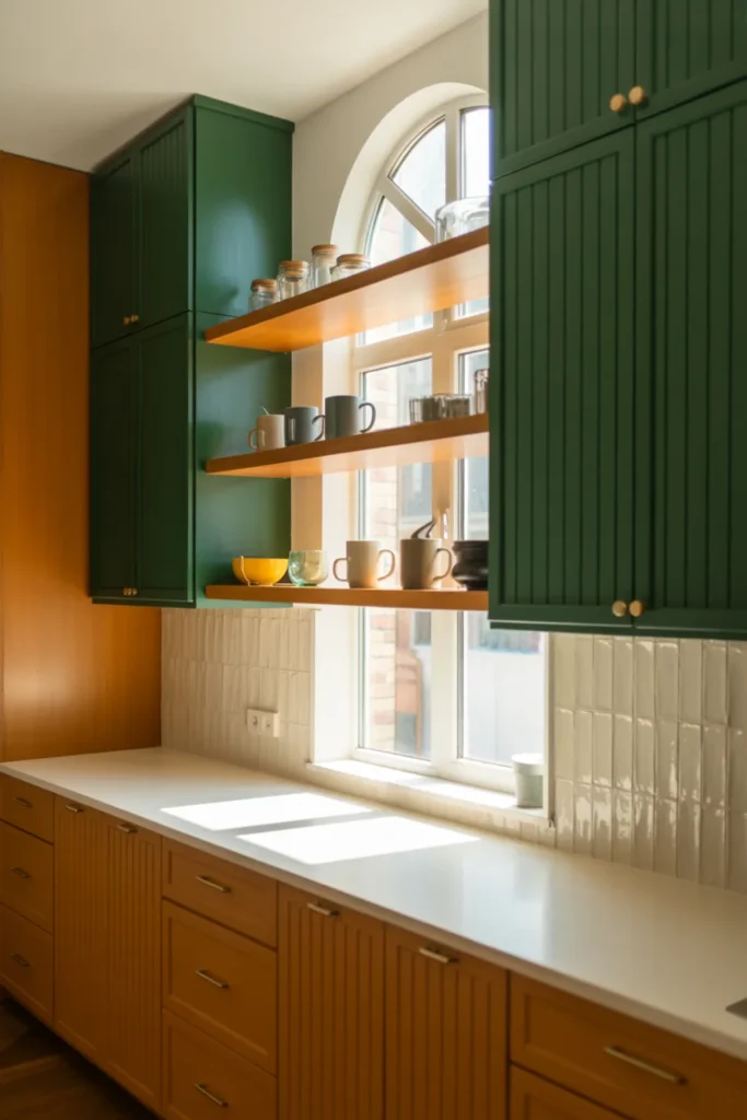 Try this in a small kitchen too, since it gives you that “open” look while still getting the green cabinet color you want.