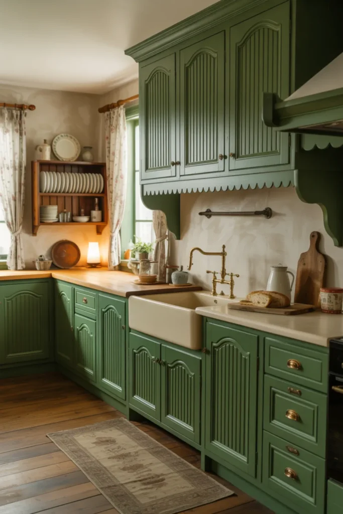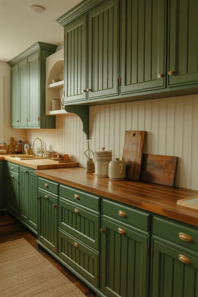 Board and batten cabinet fronts give pewter green kitchen cabinets depth, even when your color palette stays calm. Raking light is the secret, so add under-cabinet lighting or a warm pendant that casts gentle shadows on the battens.