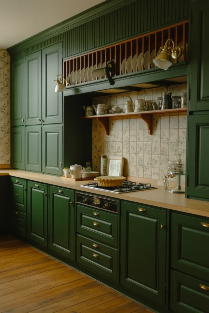 Integrated appliances make your green kitchen cabinets look custom because everything lines up clean. Panel your fridge and dishwasher in pewter green so the wall reads like one smooth surface.