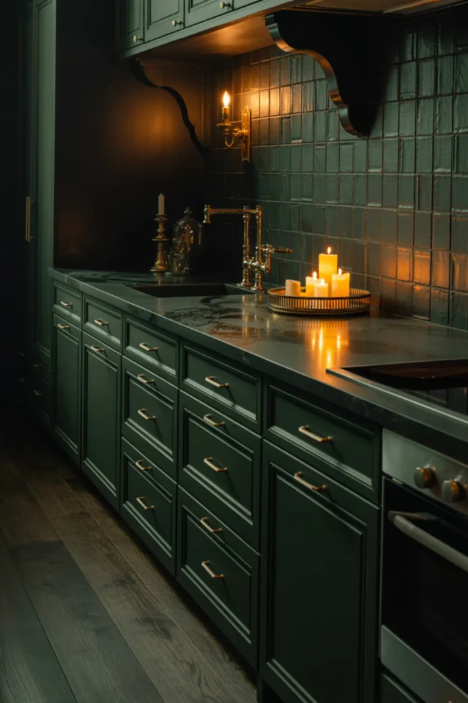 Black countertops can make pewter green cabinets look rich and dramatic, but the trick is balance. Use a bright white backsplash so the wall doesn’t feel heavy.