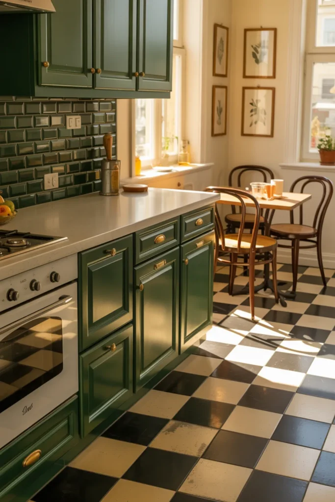 A checkerboard floor gives pewter green kitchen cabinets a bold base, but you don’t need harsh black to make it work. Choose charcoal and warm white tiles so the look feels softer and more livable.