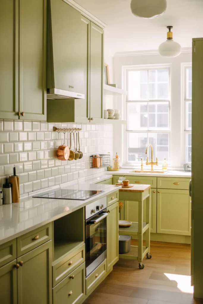 White backsplash and light counters keep the kitchen from feeling too green-heavy. A single pendant above the peninsula can define the zone and make it feel intentional.