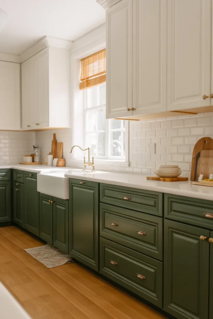 White subway tile backsplash keeps the room bright and helps both greens stand out. Black hardware works well here because it connects the shades without competing.