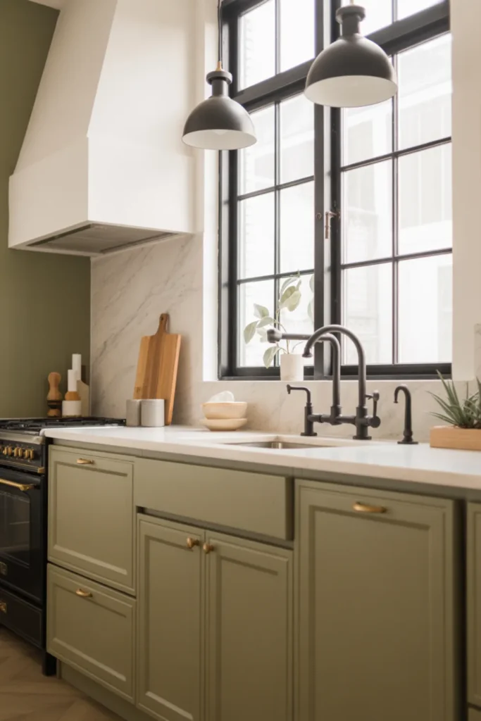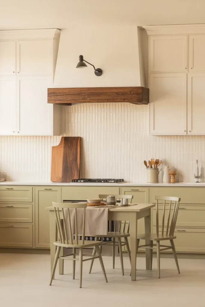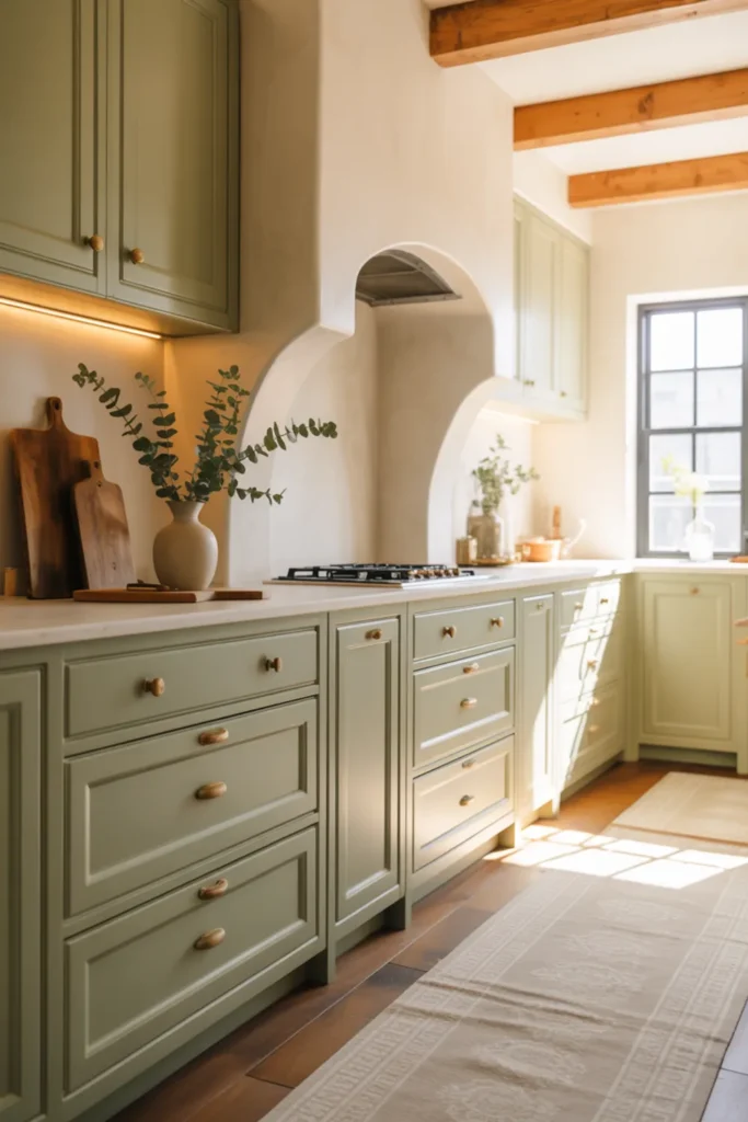 Sage cabinets are a sweet spot if you want a neutral kitchen that still has color. Beige walls or a soft plaster finish make the green feel warmer and more natural.
