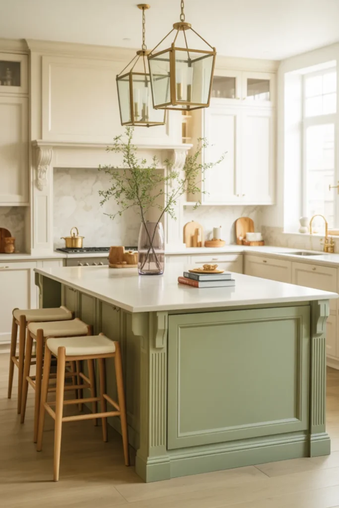 10. Two-Tone Kitchen: Sage Green Island With Neutral Perimeter Cabinets