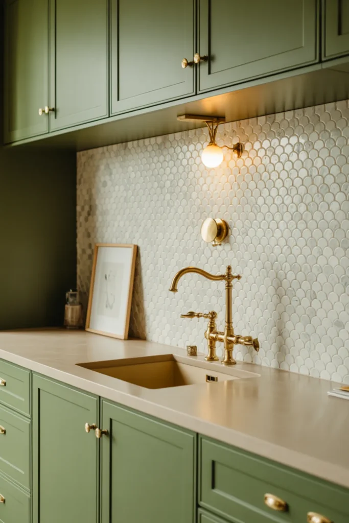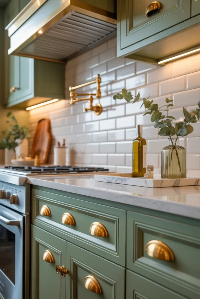 Keep the backsplash warm white so the green and gold don’t compete. Under-cabinet lighting helps the hardware glow at night and makes the cabinet color feel richer.