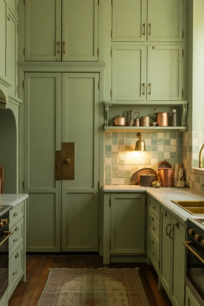 Add a small lamp on the counter for a lived-in touch, and your sage green kitchen instantly feels calm, warm, and pulled together.