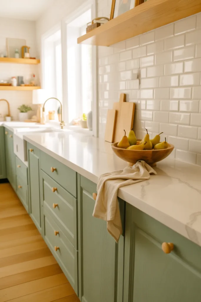Light sage kitchen cabinets feel fresh, but the magic really happens when you pair them with bright white countertops. The contrast keeps the space clean and modern, even in a smaller kitchen.