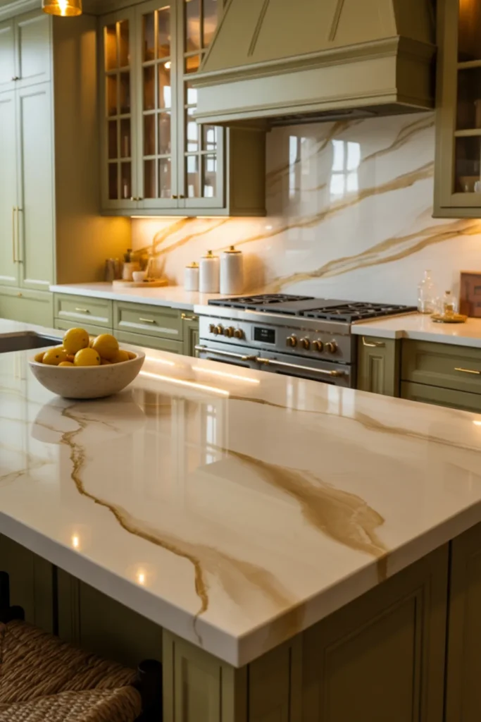 Taj Mahal quartzite countertops make sage green kitchen cabinets look high-end without feeling flashy. That creamy-beige movement warms the green and keeps the whole palette soft.
