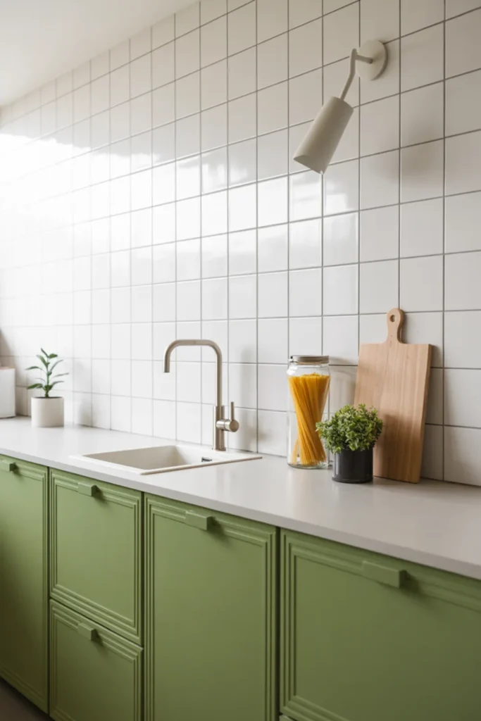 Choose a warm white backsplash so the space doesn’t turn icy. Matte black fixtures add clean contrast and help the green read stronger.