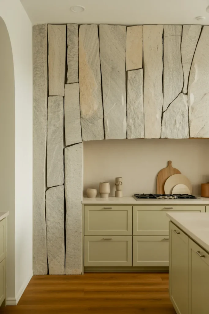 A stone backsplash with texture can make green kitchen cabinets look seriously custom. Chiseled edges and natural variation bring depth you just can’t get from flat tile.