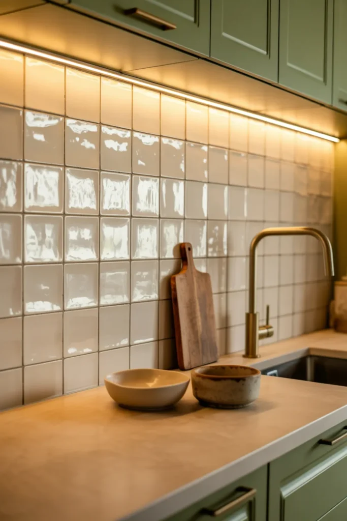 A sage and gold kitchen gets its charm from warm lighting and a bit of shine. Glossy zellige-style tile bounces light around, so the space feels lively even in the evening.