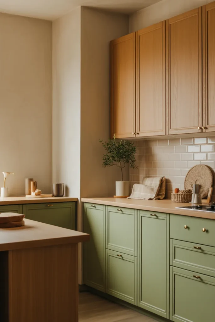 25. Neutral Kitchen Balance: Sage Cabinets With Beige and Warm Wood