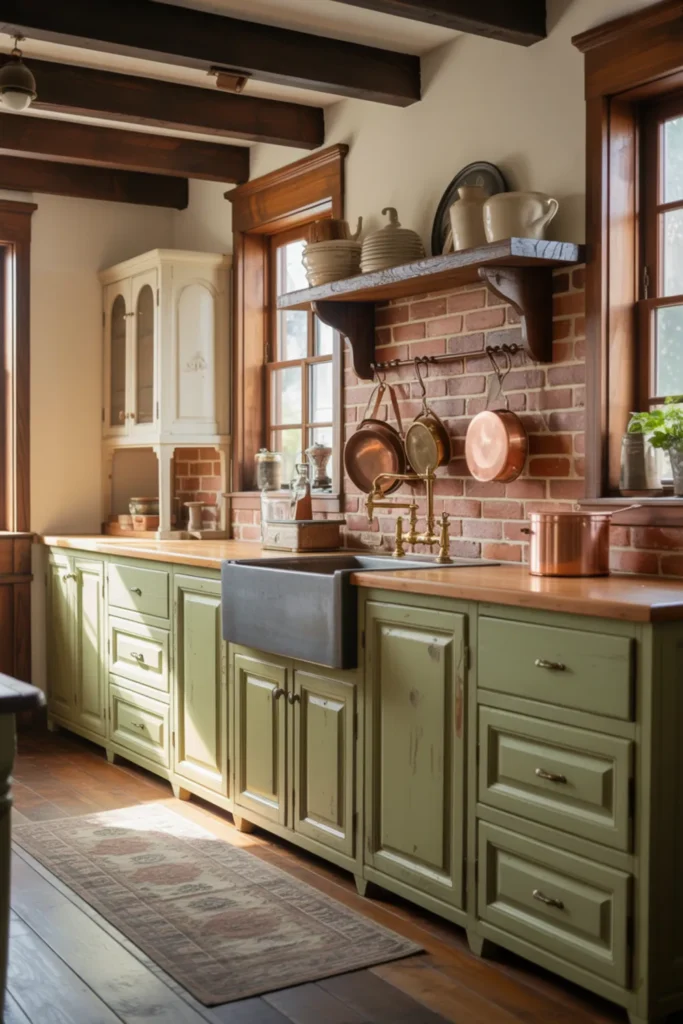 26. Rustic Farmhouse Sage Kitchen With Vintage-Inspired Details