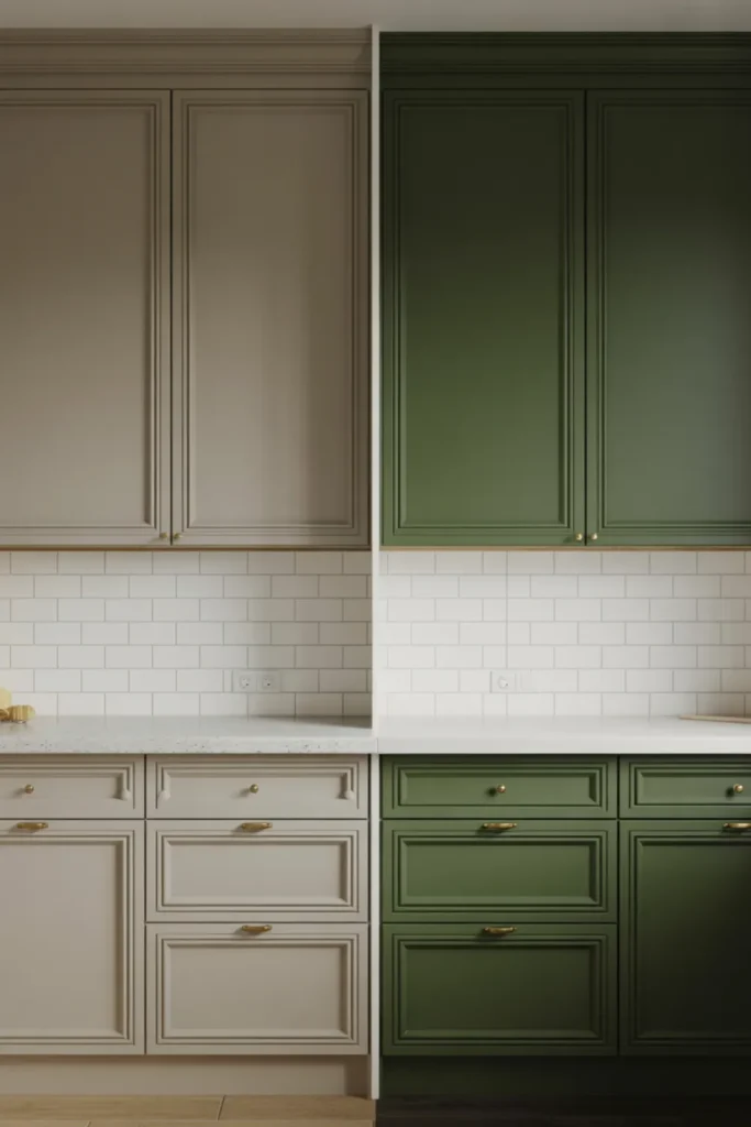 Calke green tends to look deeper and more historic, so it shines in classic kitchen design styles. Keep your counters and hardware the same while you test, so you’re judging the color honestly.
