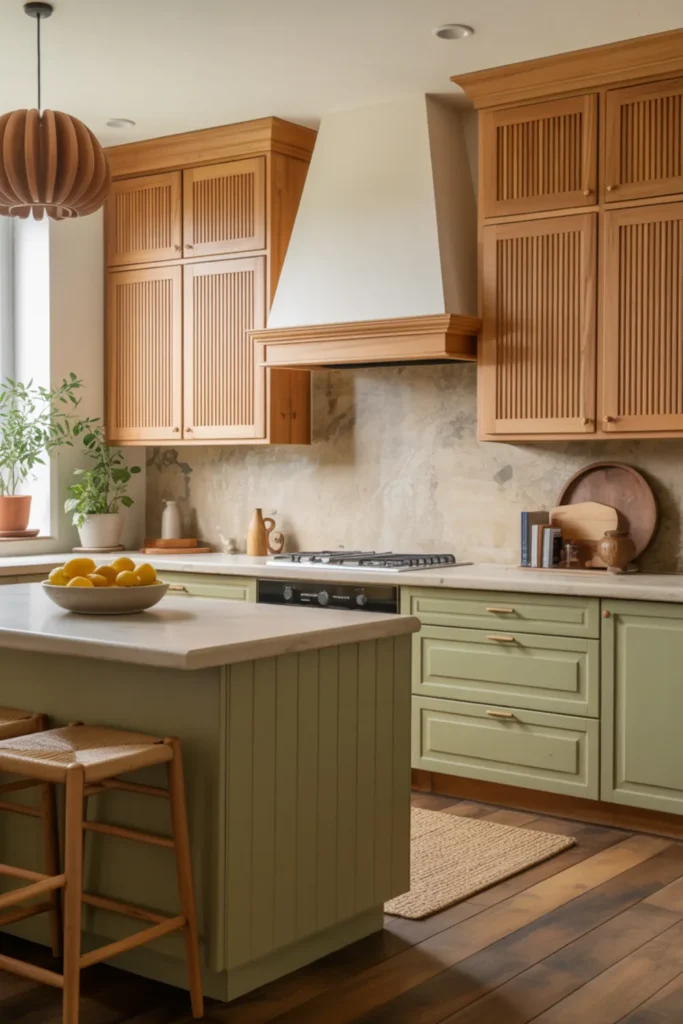 Sage green and wood kitchen cabinets are a go-to if you want an earthy green kitchen that still feels upscale. Fluted wood uppers or reeded details add depth, even if the color palette stays neutral.