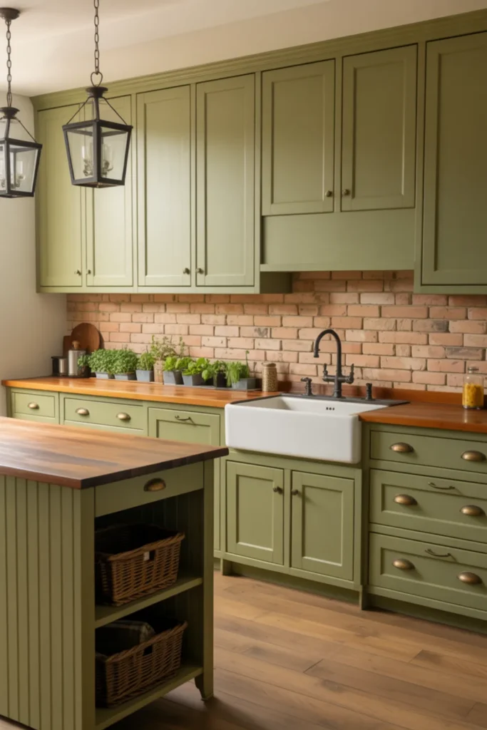 Sage green kitchen cabinets farmhouse style feel instantly homey when you stick with classic shaker doors. Add an apron-front sink and you’ve got that cozy, hardworking focal point.