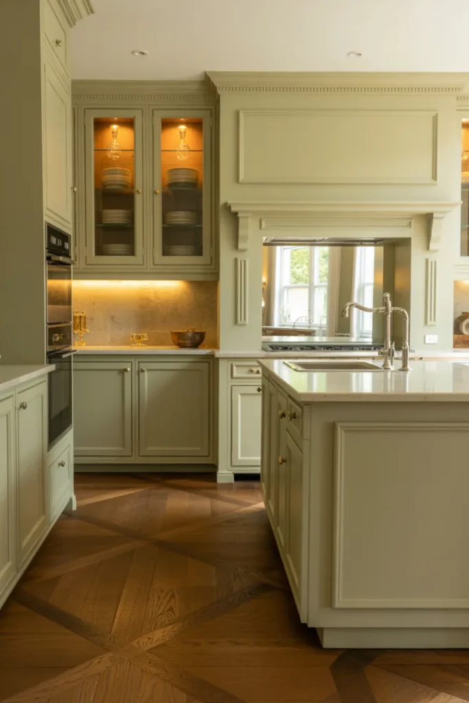 8. Classic Kitchen Design With Sage Cabinets and Simple Molding