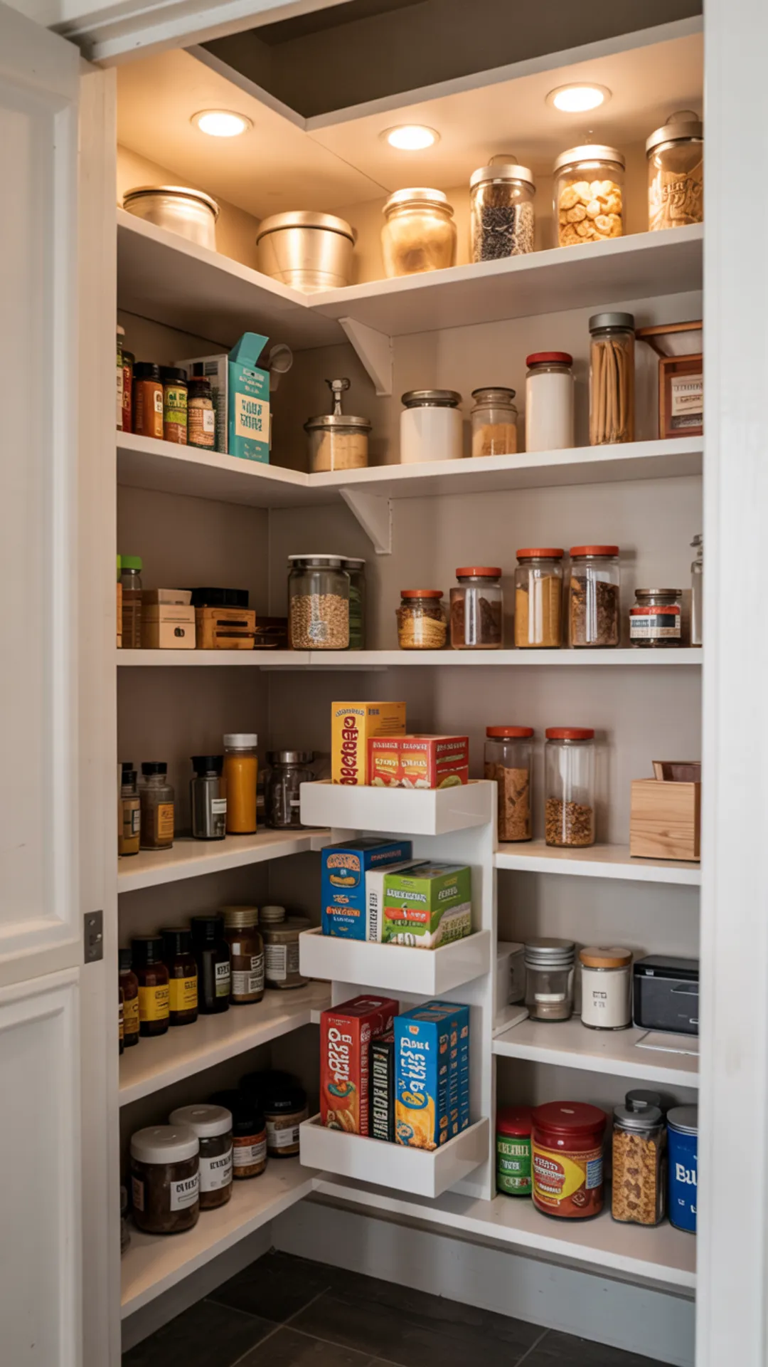 A 2×2 pantry can still feel functional if you treat corners like prime real estate. Use L-shaped shelving and add a turntable in the corner for oils, sauces, or small jars.