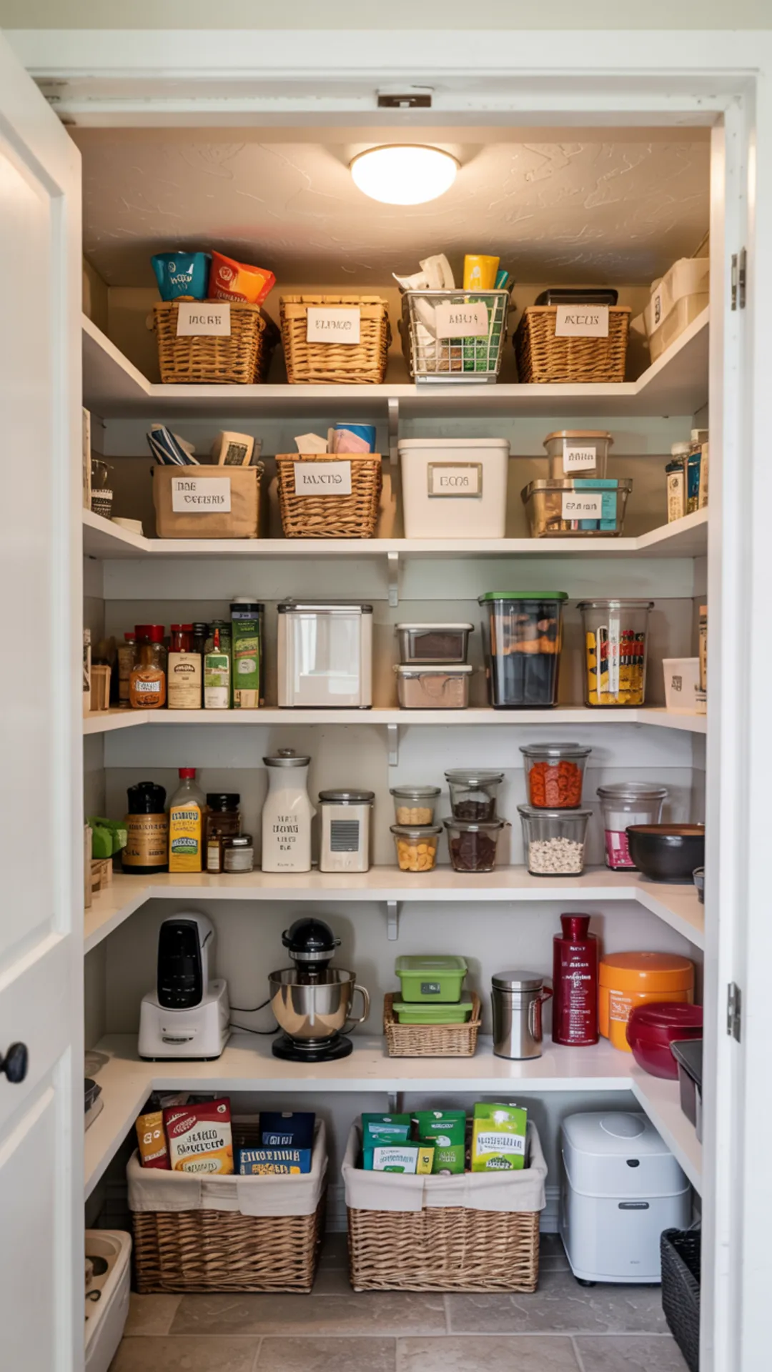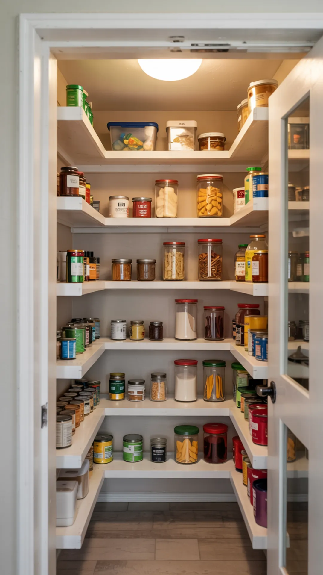 Open the door to reveal organized shelves with snacks, dry goods, and pantry storage containers. Interior lighting helps everything stay visible, even in a deep closet.