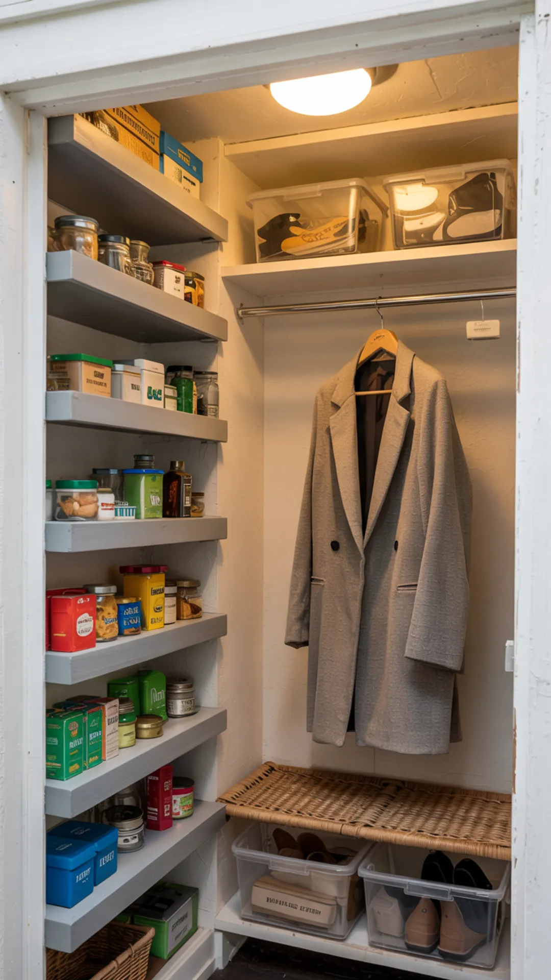 A coat closet doesnโt have to be all or nothing. Split the space so one side handles pantry storage while the other keeps a few jackets or bags.