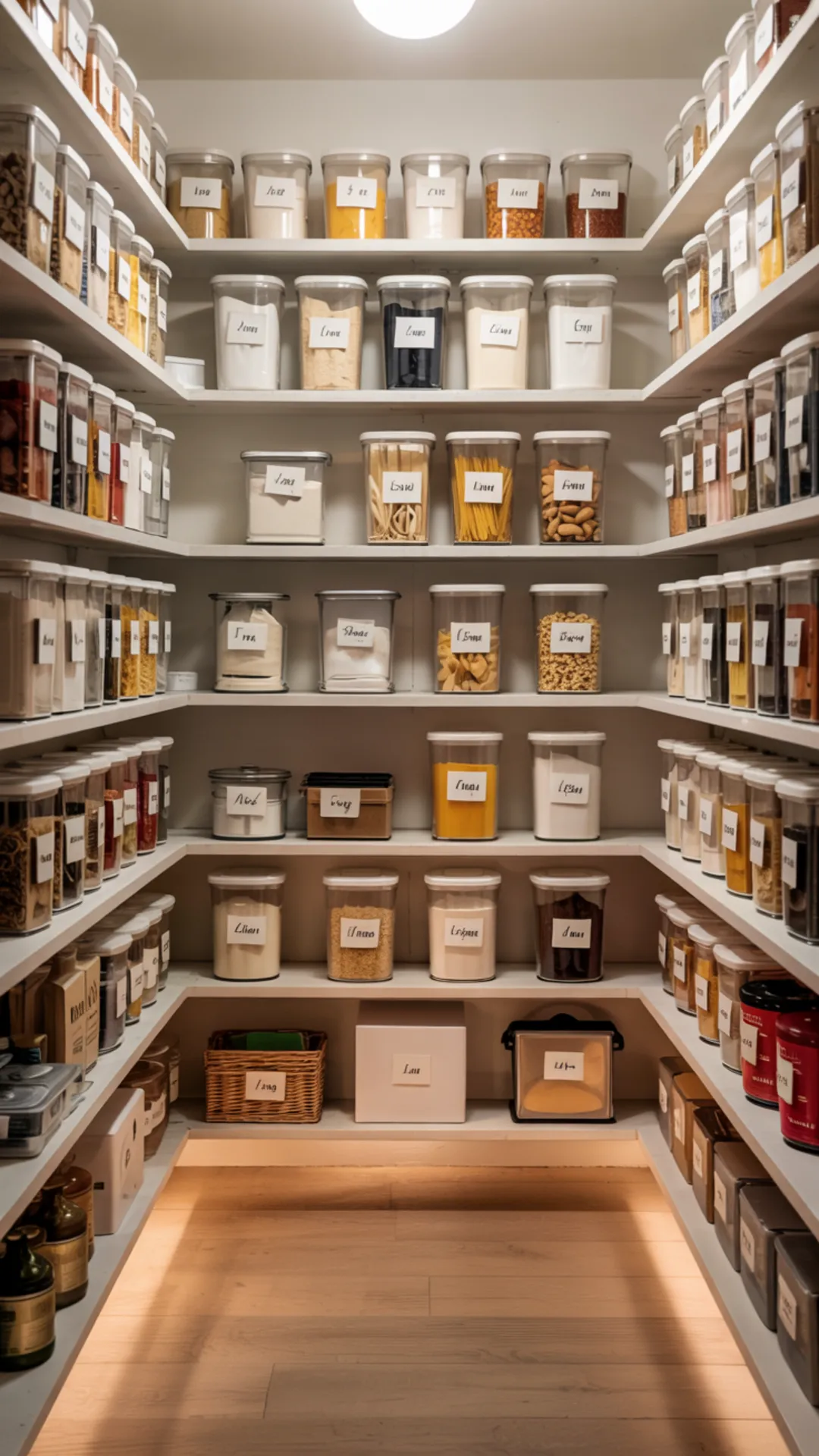 Stick to a few container sizes to keep shelves tidy. Group snacks, baking, and breakfast into zones so the pantry stays easy to reset.