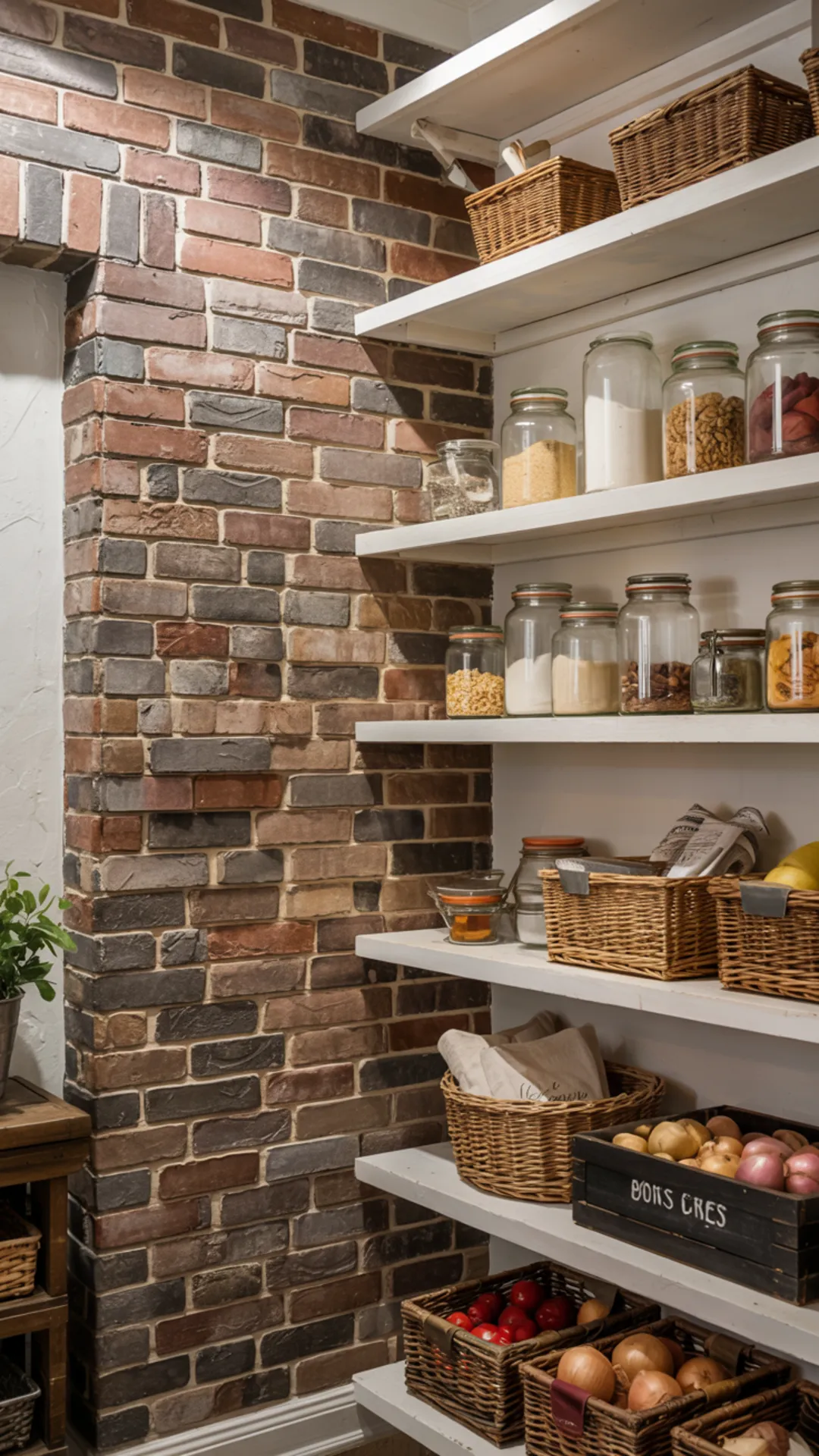 Pair the brick look with white shelves so food stays the focus. Wooden crates or baskets work well for produce like potatoes and onions.