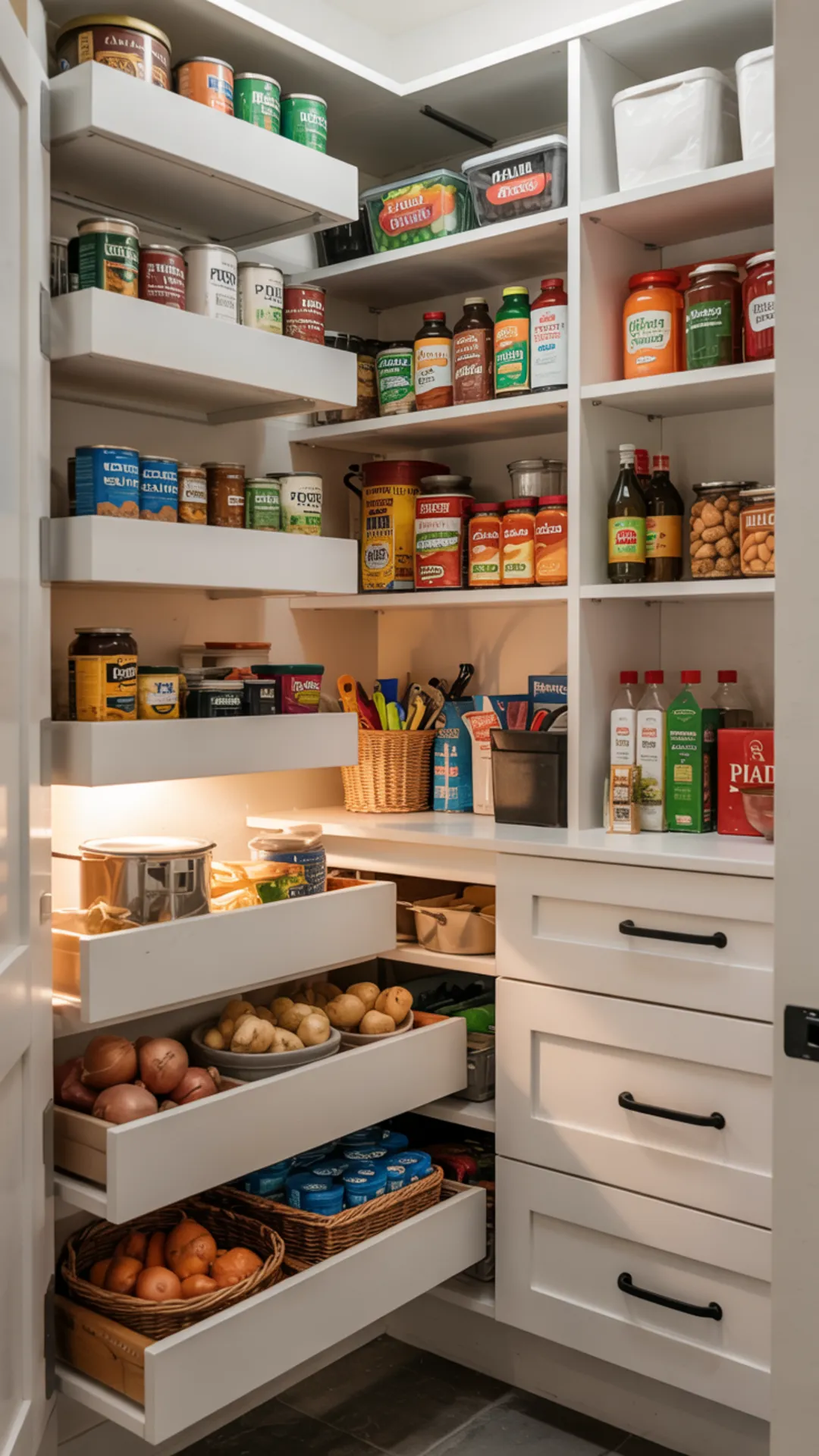 Keep potatoes and onions in breathable baskets so they donโt get buried. Use risers for cans and jars so labels stay front and center.