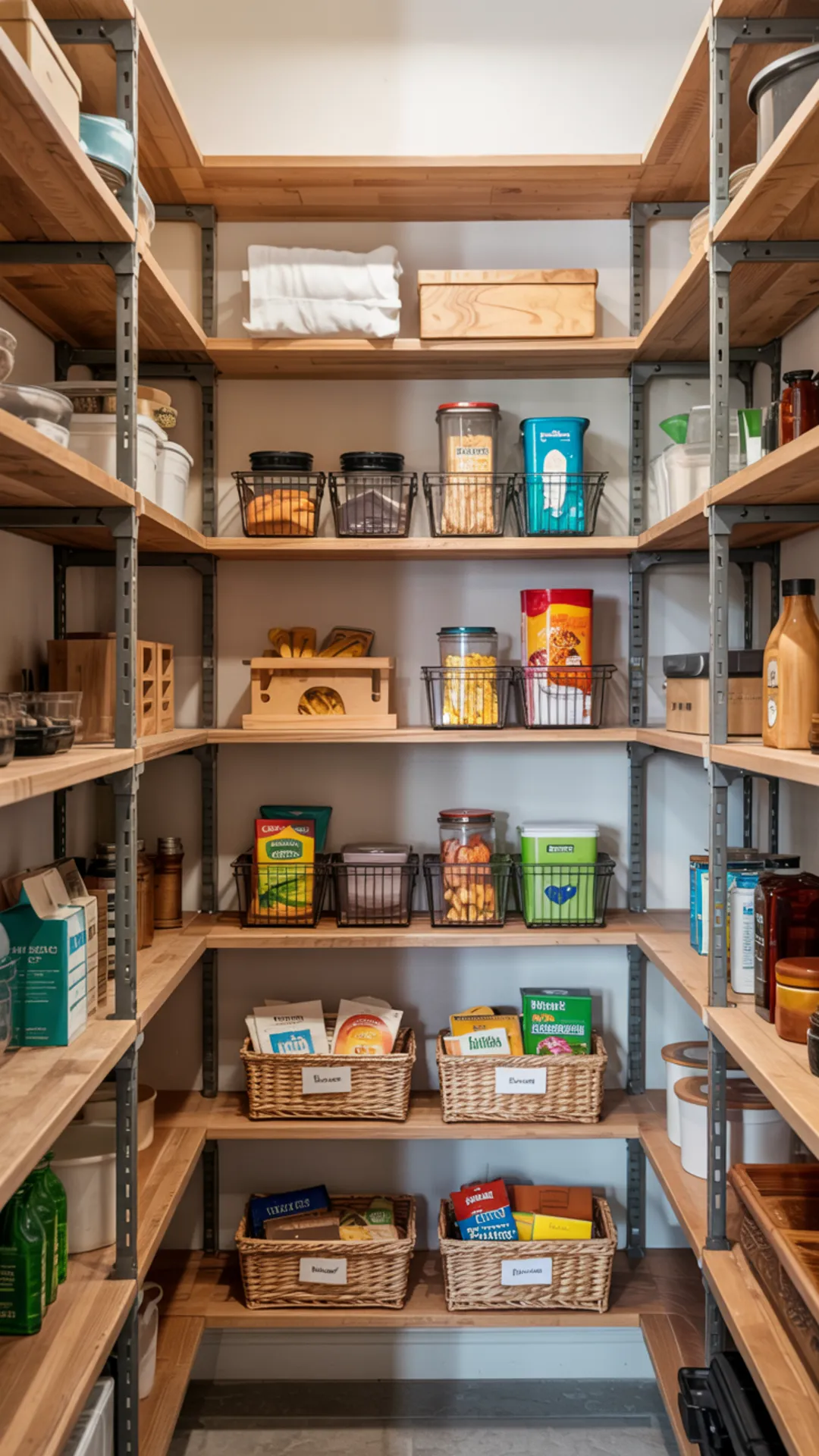 Group extras and backstock up top in baskets so it looks tidy. With this kind of pantry organization for small pantry spaces, youโll spend less time searching and more time cooking.
