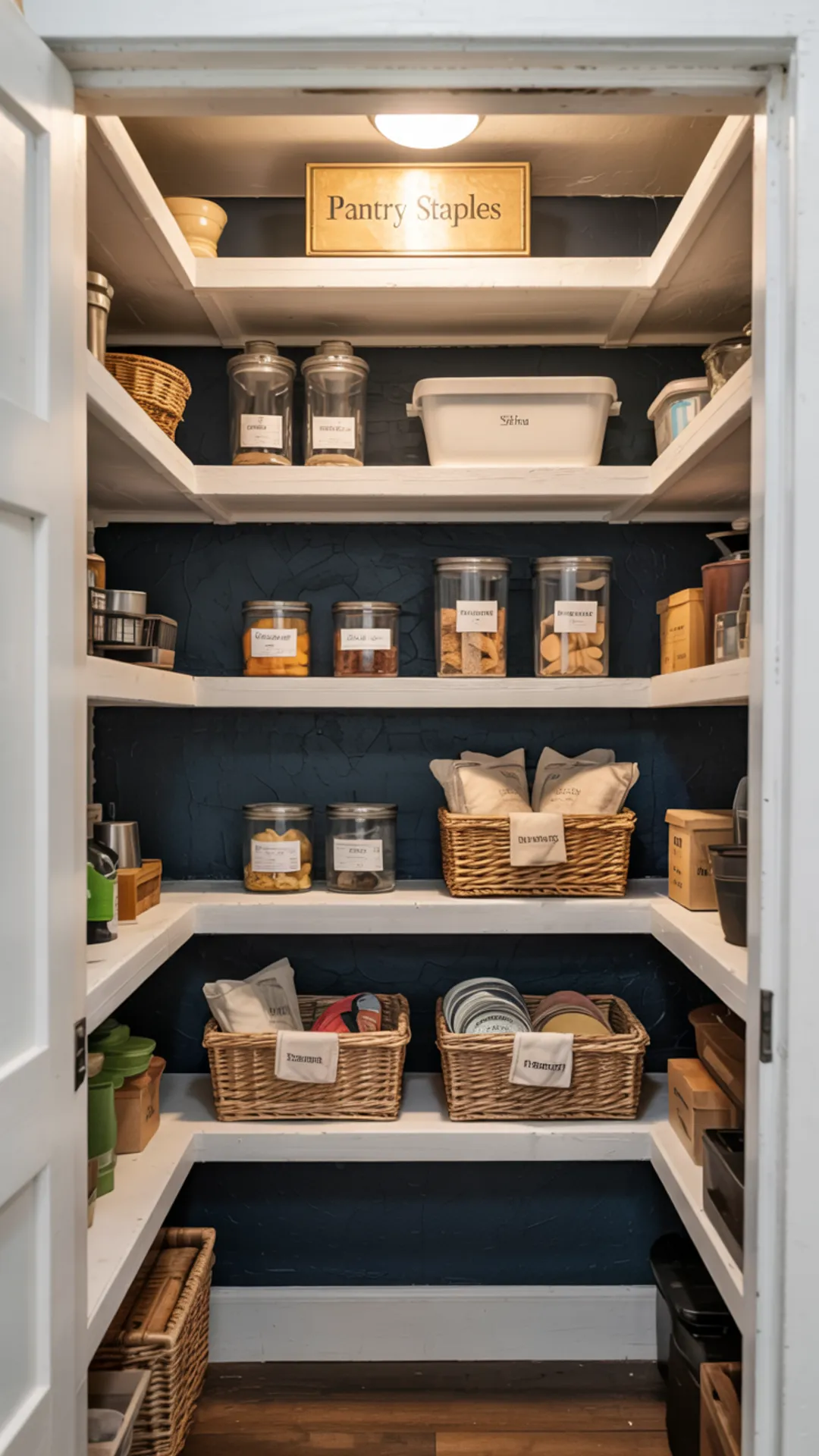 Write simple sections like snacks, baking, or breakfast so everyone knows where things go. Inside the closet pantry, keep shelves clean and consistent so the door detail stands out.