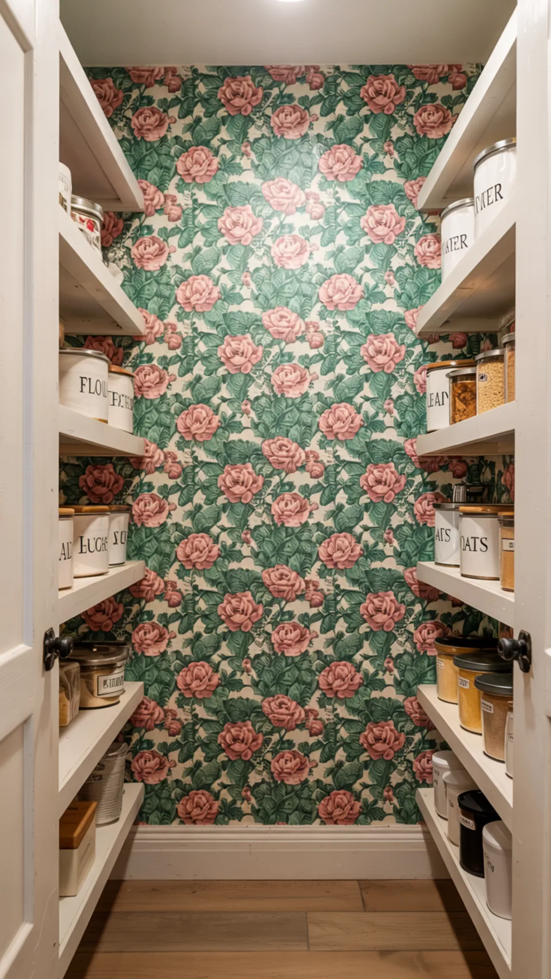 A pantry closet wallpaper accent adds personality without eating up space. Keep the wallpaper on the back wall so shelves still feel clean and bright.