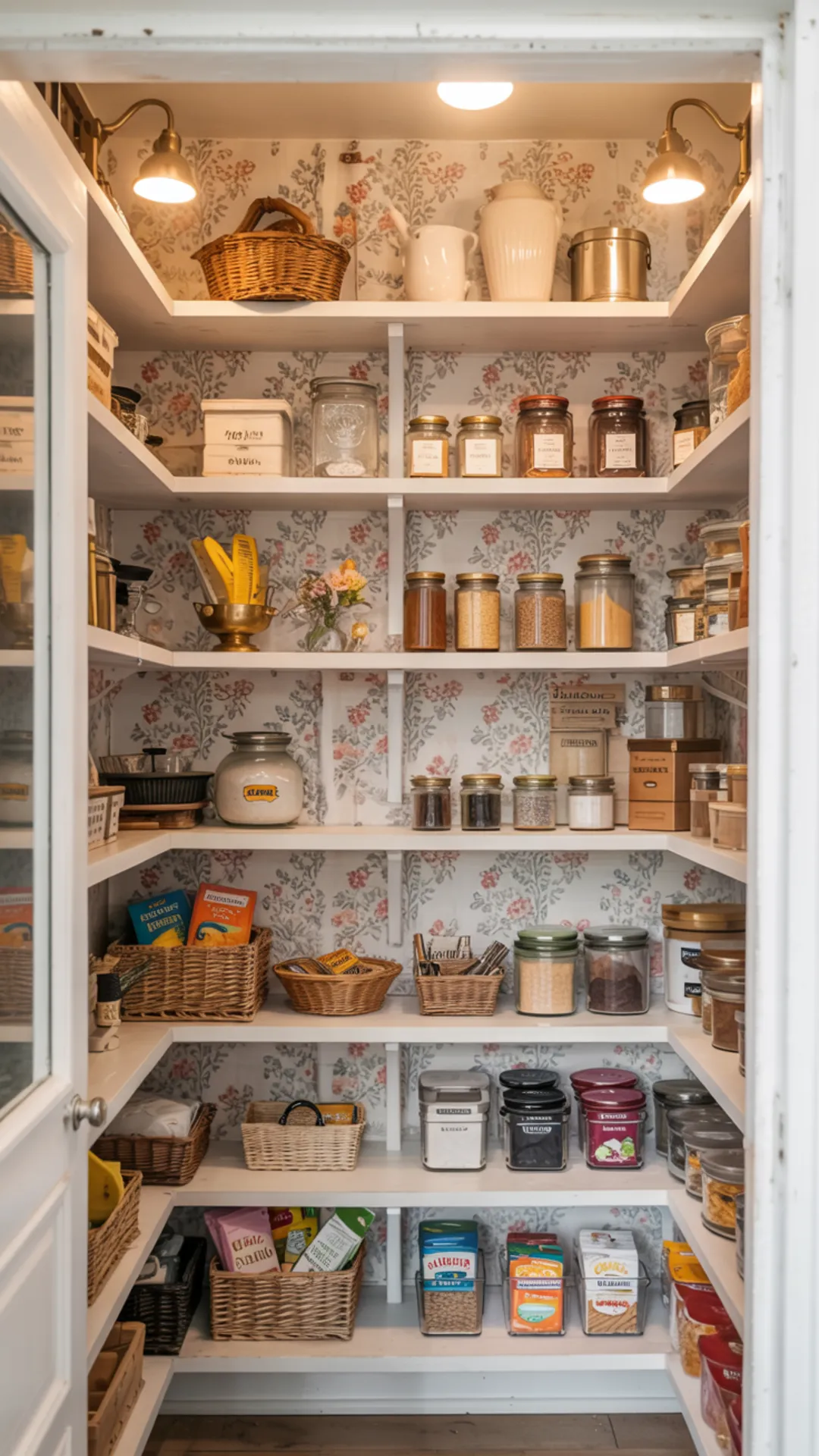Clear pantry storage containers help the look stay crisp and easy on the eyes. Warm lighting brings out the wallpaper texture and makes labels easier to read.