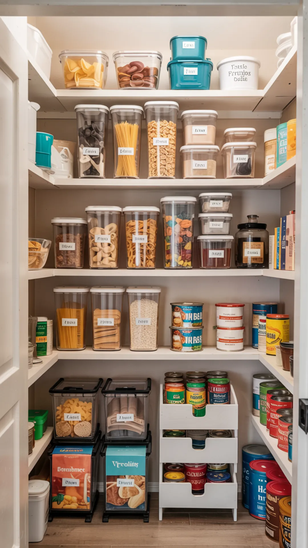 Labels help everyone put items back without guessing. When containers match, the whole pantry closet feels bigger and calmer.
