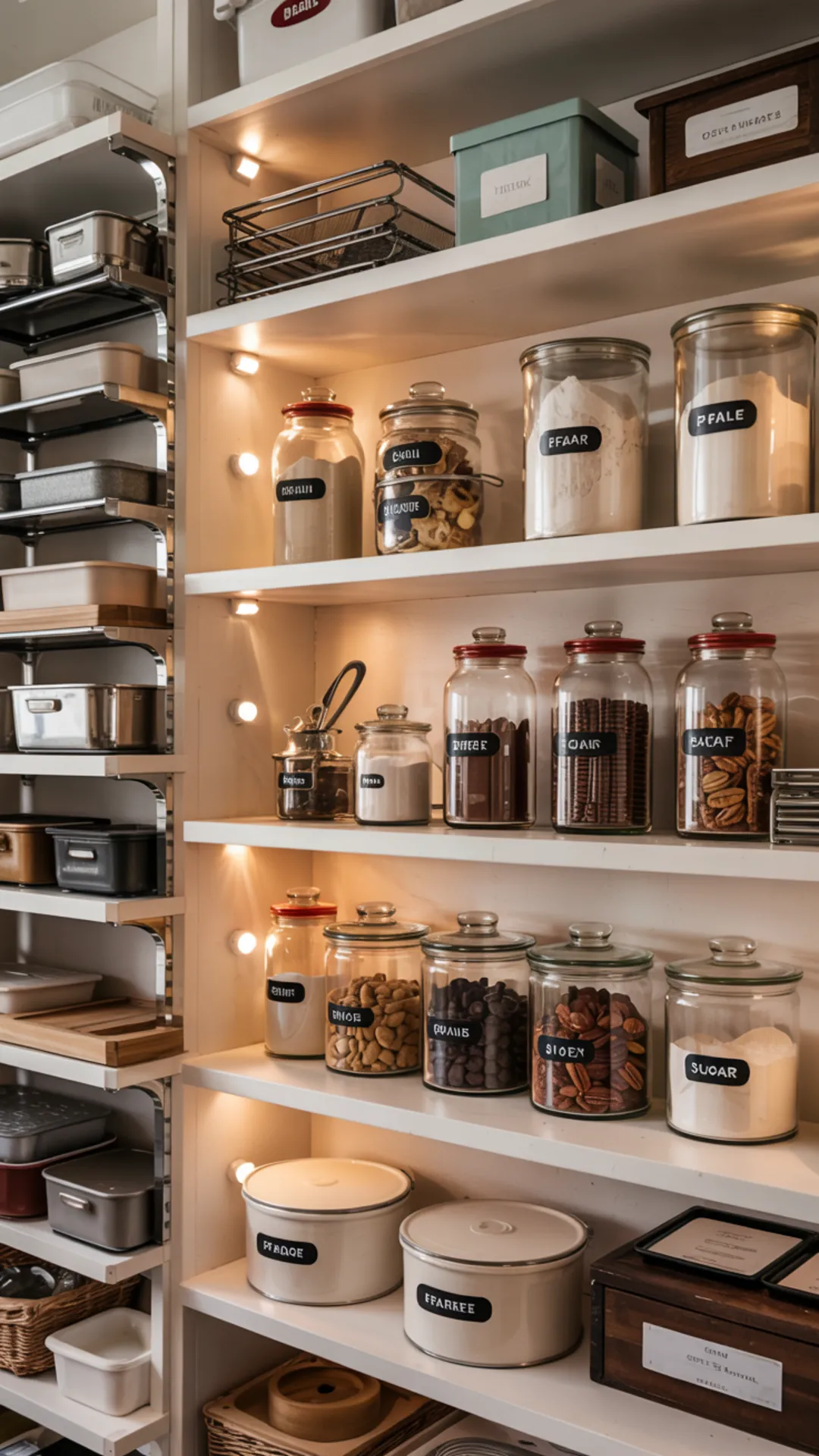 Store add-ins like chocolate chips and nuts in small jars you can grab fast. Keep baking sheets or cutting boards upright on one side to save shelf space.