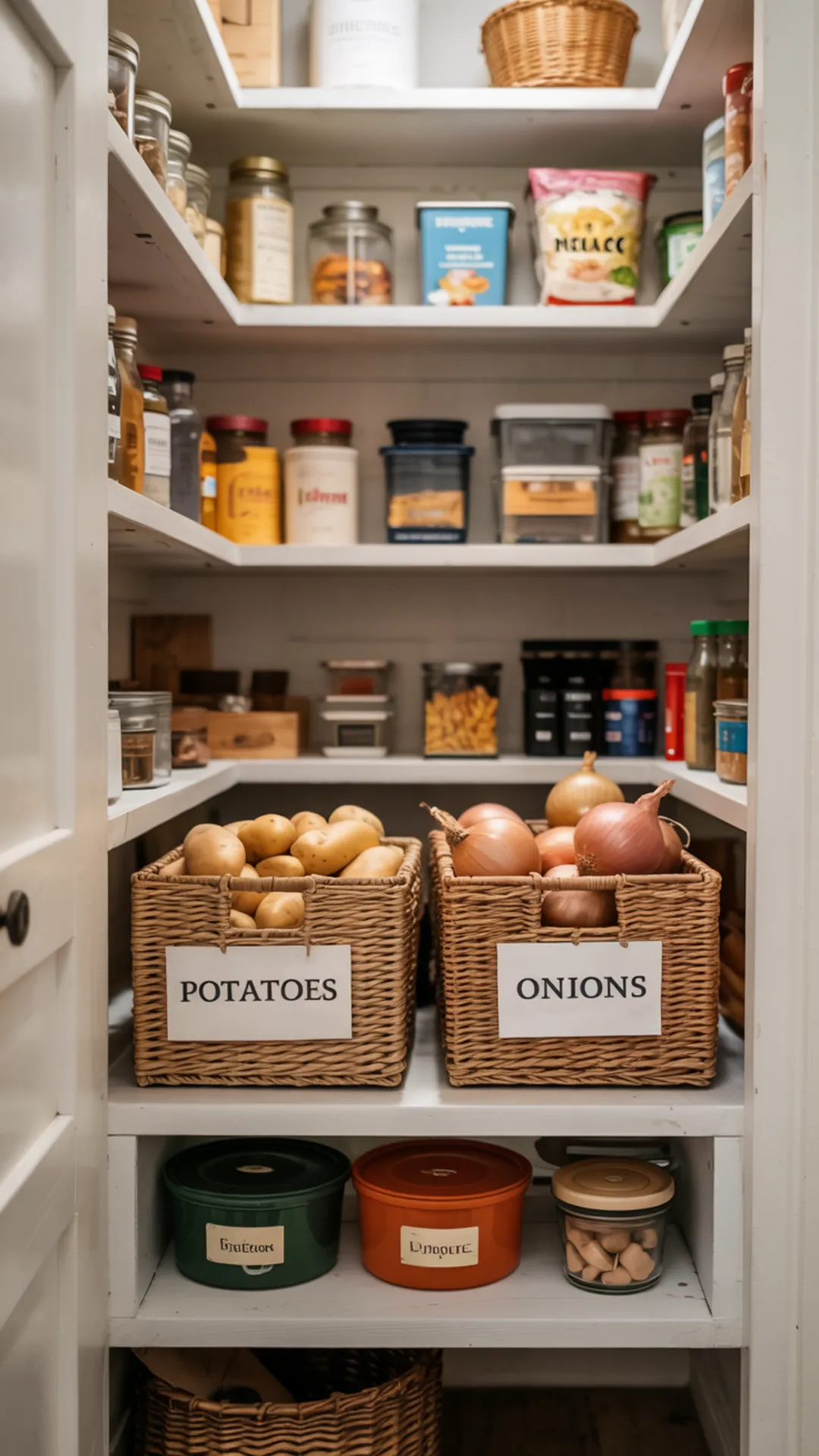 Keep the rest of the pantry organized with bins above. These potato and onion storage ideas pantry setups look tidy and feel practical.