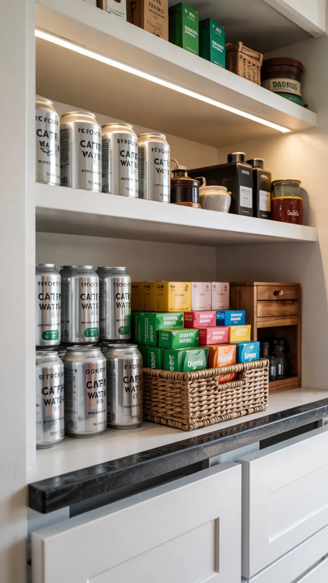 A dedicated beverage shelf keeps drinks from taking over the whole pantry. Line up cans so labels face forward and add a low rail to prevent rolling.