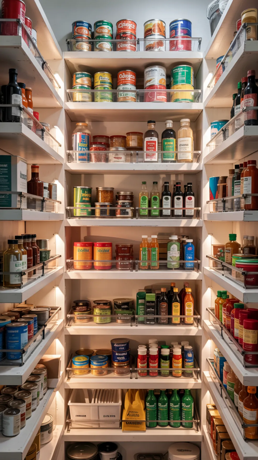 Light strips make the depth feel less shadowy, which helps you spot things quickly. This pantry with deep shelves stays neat because you can actually see what you own.