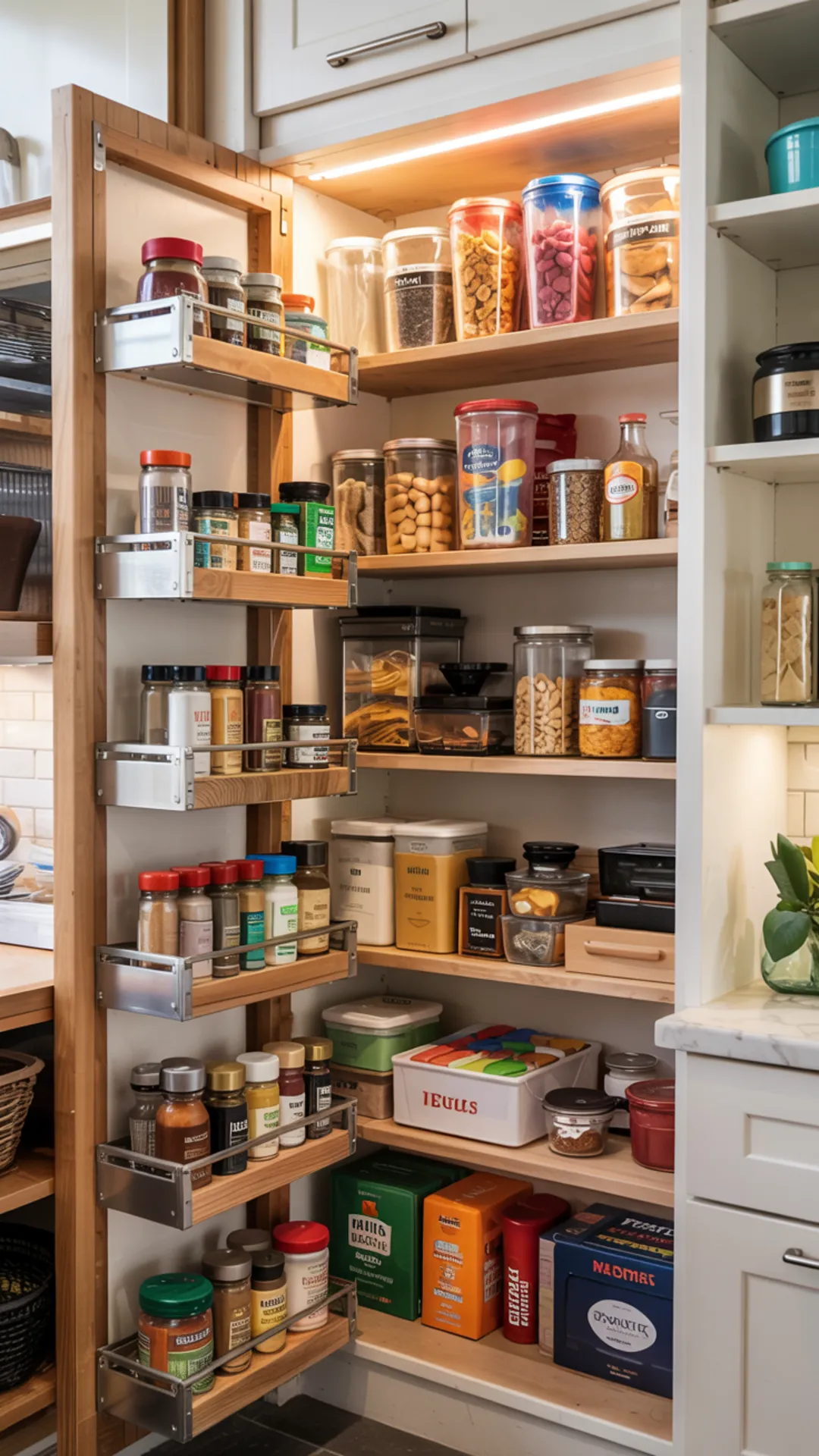 35) Tiny Pantry Closet With Slide-Out Spice Shelves on the Side Walls