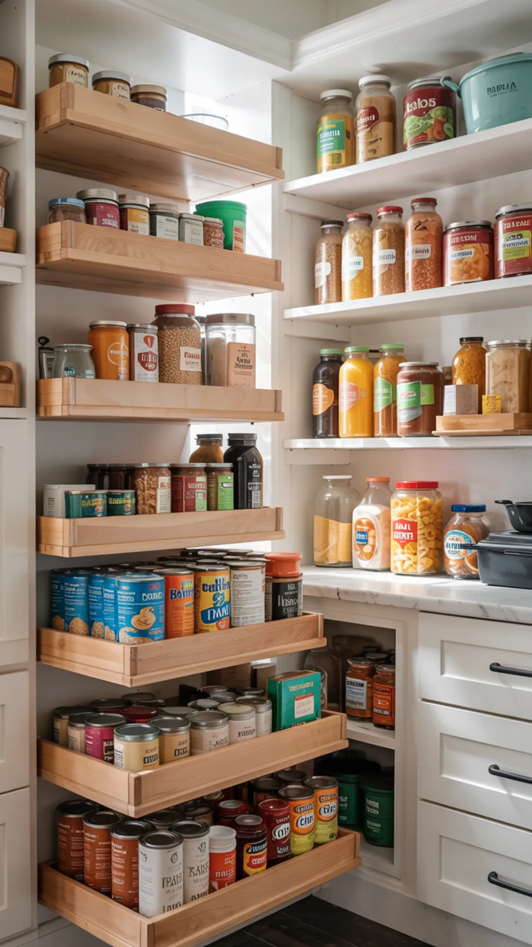 Store cans and jars on trays, then keep taller containers on fixed shelves above. Use shelf rails so items donโt tip when you move the tray.