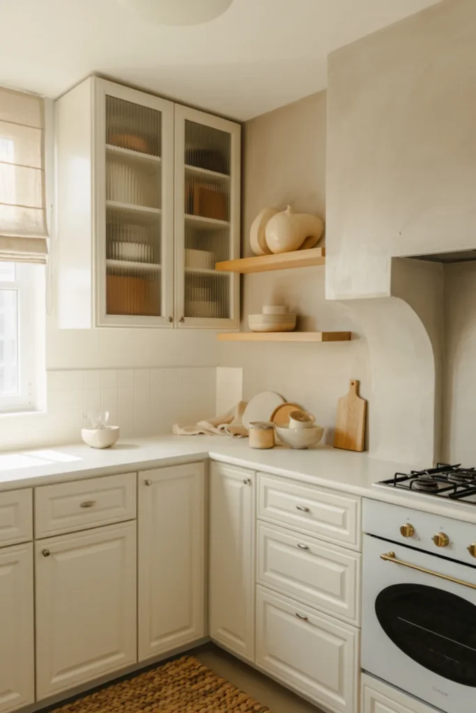 An all-white small kitchen feels cozy when you mix textures, not colors. Layer limewash walls, ribbed glass cabinet doors, and a woven runner to break up the white.