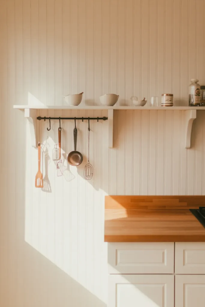 Beadboard adds personality without stealing space. Paint it the same warm white as your white kitchen cabinets so the room stays cohesive, then use hooks for utensils to free up drawers.