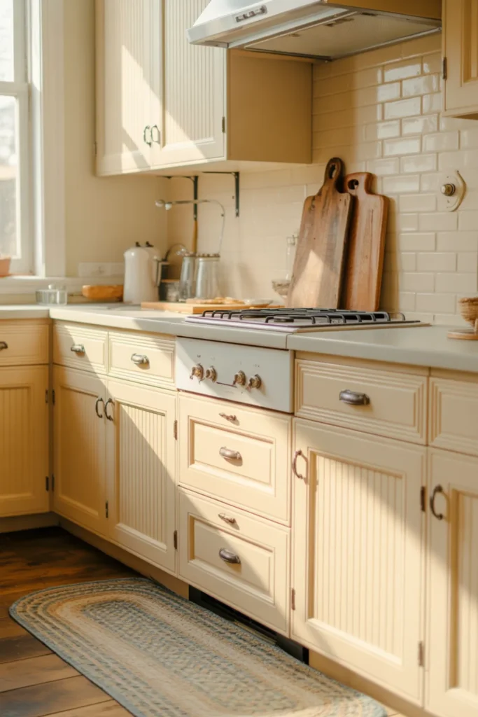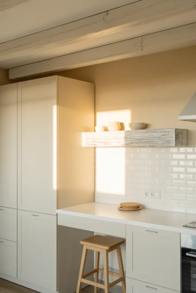 Test paint samples in morning and evening light, since cream shifts a lot. You can also mix finishes by keeping the walls crisp white and letting the cabinets do the soft work.