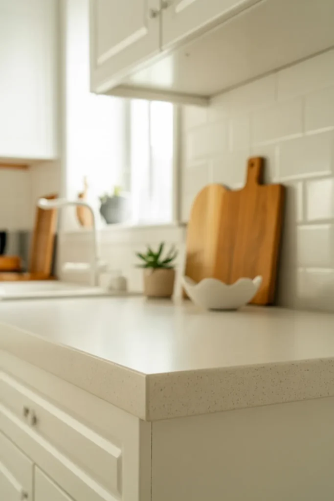 You’ll also hide smudges better, which is helpful in a tight cooking area. Pair the counters with a subtle backsplash texture so the space still has depth.