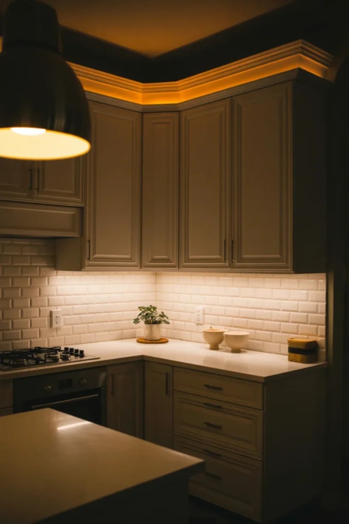 16) Layered Lighting Plan: Pendant + Under-Cabinet Glow