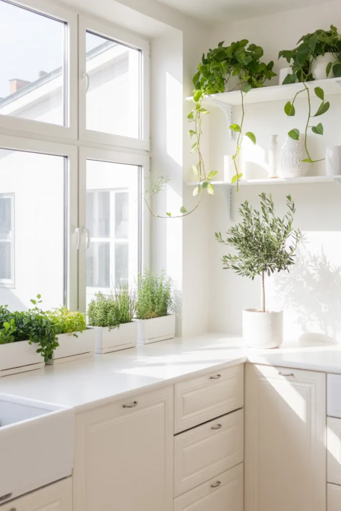 Greenery makes a small white kitchen with plants feel alive right away. Pop herbs on the windowsill, then tuck a trailing pothos on an open shelf for a soft, relaxed look.