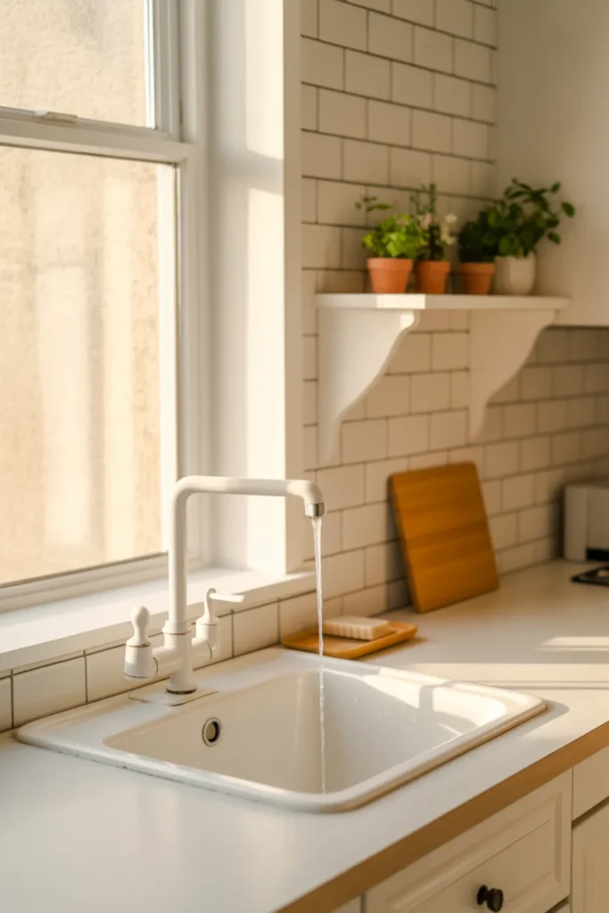 Natural light helps everything look cleaner, plus it makes simple tasks feel less annoying. Keep the sill tidy with one small plant and a slim soap tray, then use a bright backsplash to bounce light back into the room.
