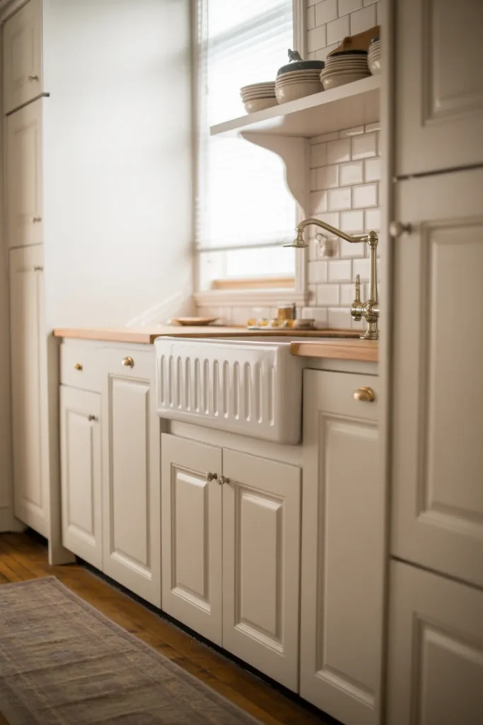 Open shelves above it look great, but keep them minimal—stack dishes and stop there. A vintage runner adds warmth and helps an all-white small kitchen feel less stark. If you want a twist, use a slightly creamy “antique white” cabinet paint for softness.