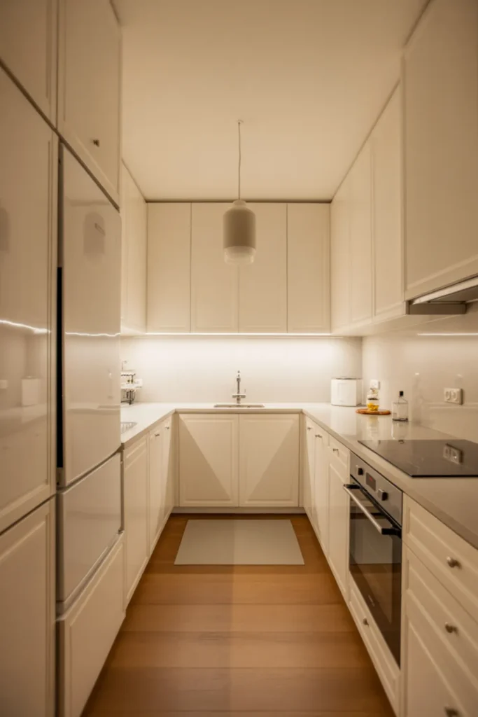 Under-cabinet lighting helps your counters glow at night, even in a narrow cooking area. Limit countertop items to a tray and one plant, so the walkway stays open.